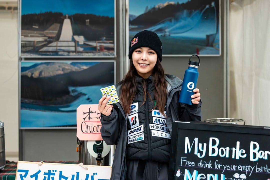 札幌大会 Hospitality Booth髙梨沙羅と藤女子高等学校(北海道・札幌市)の1年生〜3年生(24名)・OG(2名)が、「JUMP for The Earthプロジェクト」と「藤女子高等学校Blue Earth Project」コラボブースにてマイボトルバーを実施しました。