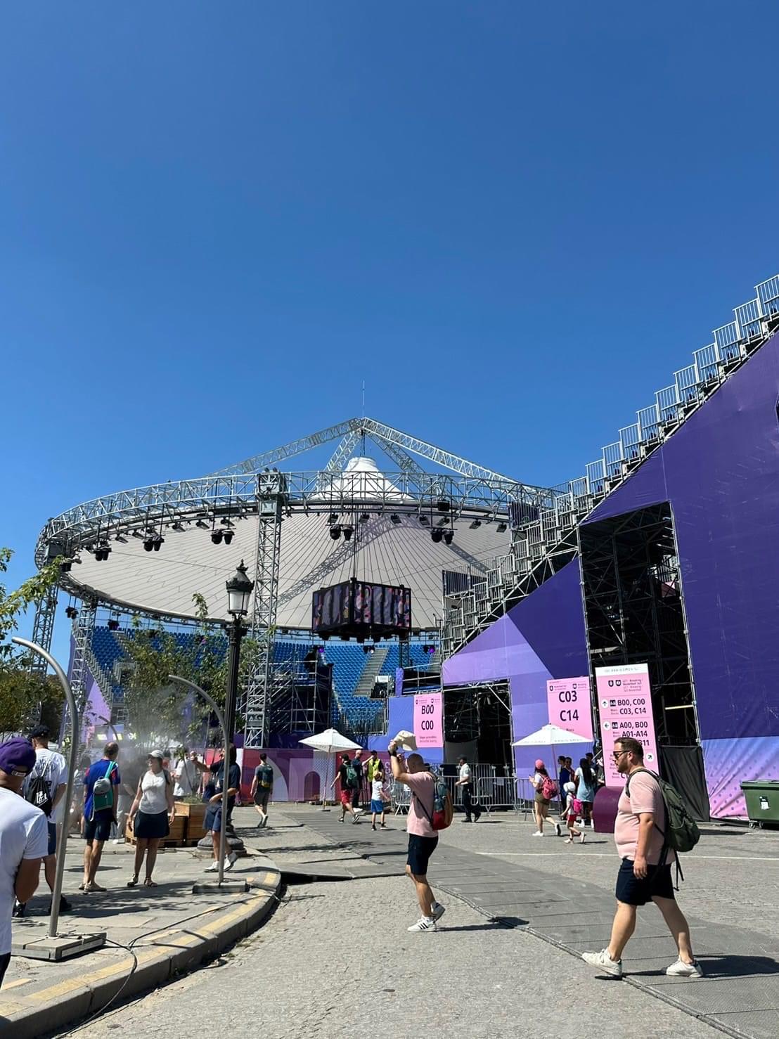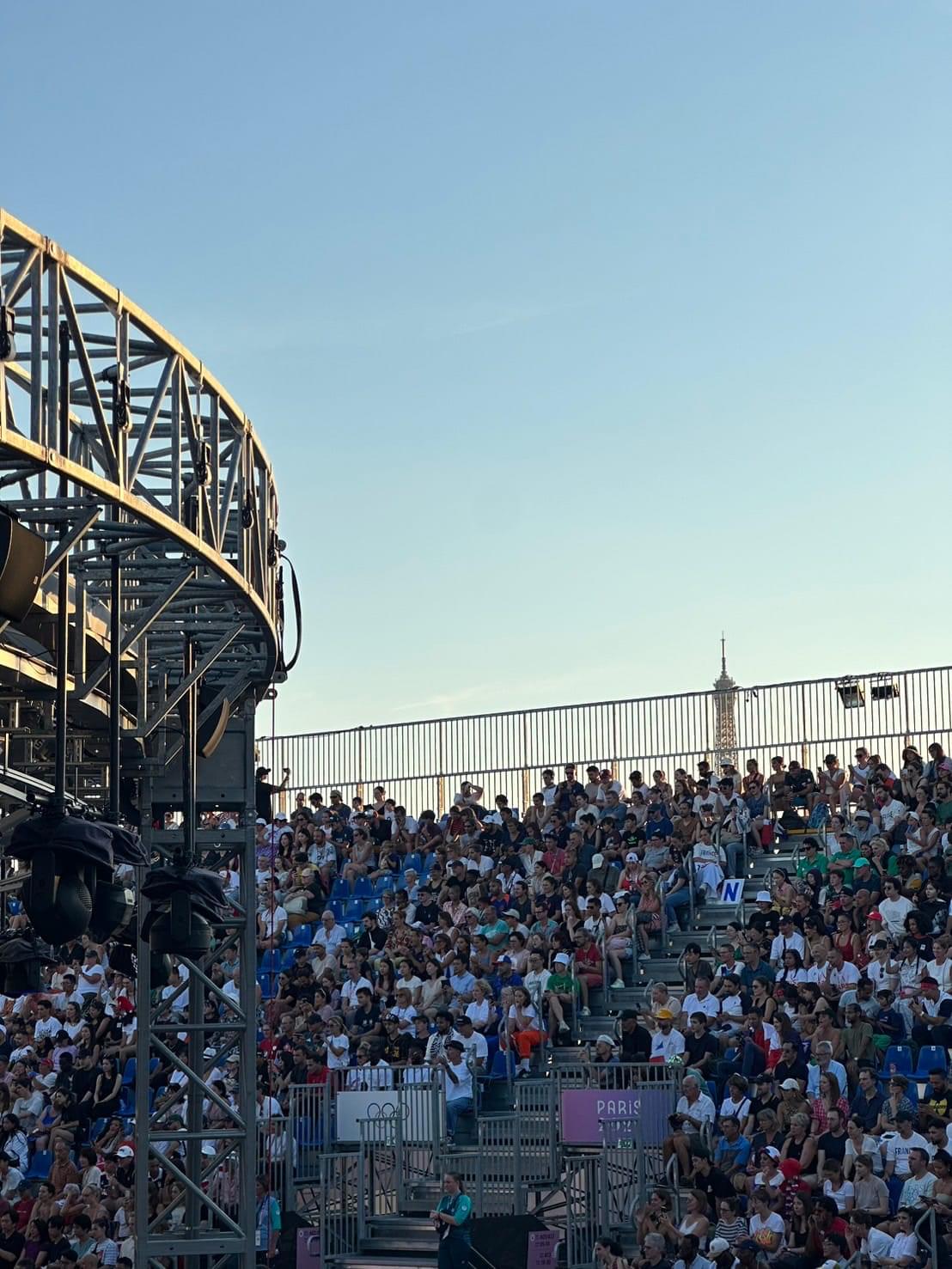 コンコルド広場にはアーバンパークの仮設会場が設営されていて、大会終了後には使われた資材は地元で再利用されるそうです。ブレイキン会場の観客席からは世界遺産でもありパリの象徴エッフェル塔も見えました。